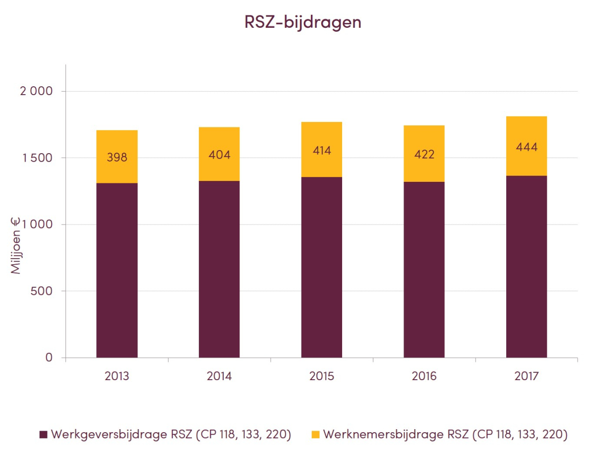 Daarbovenop droegen de werknemers in de voedingsindustrie in 2017 nog eens additioneel 444 miljoen euro bij aan de sociale zekerheid. Ten opzichte van 2016 is dit een stijging van 5,1%, goed voor 14,1% van de totale RSZ-werknemersbijdragen in de verwerkende industrie. Ten opzichte van 2013 namen de RSZ-werknemersbijdragen in de voedingsindustrie toe met 11,4%.