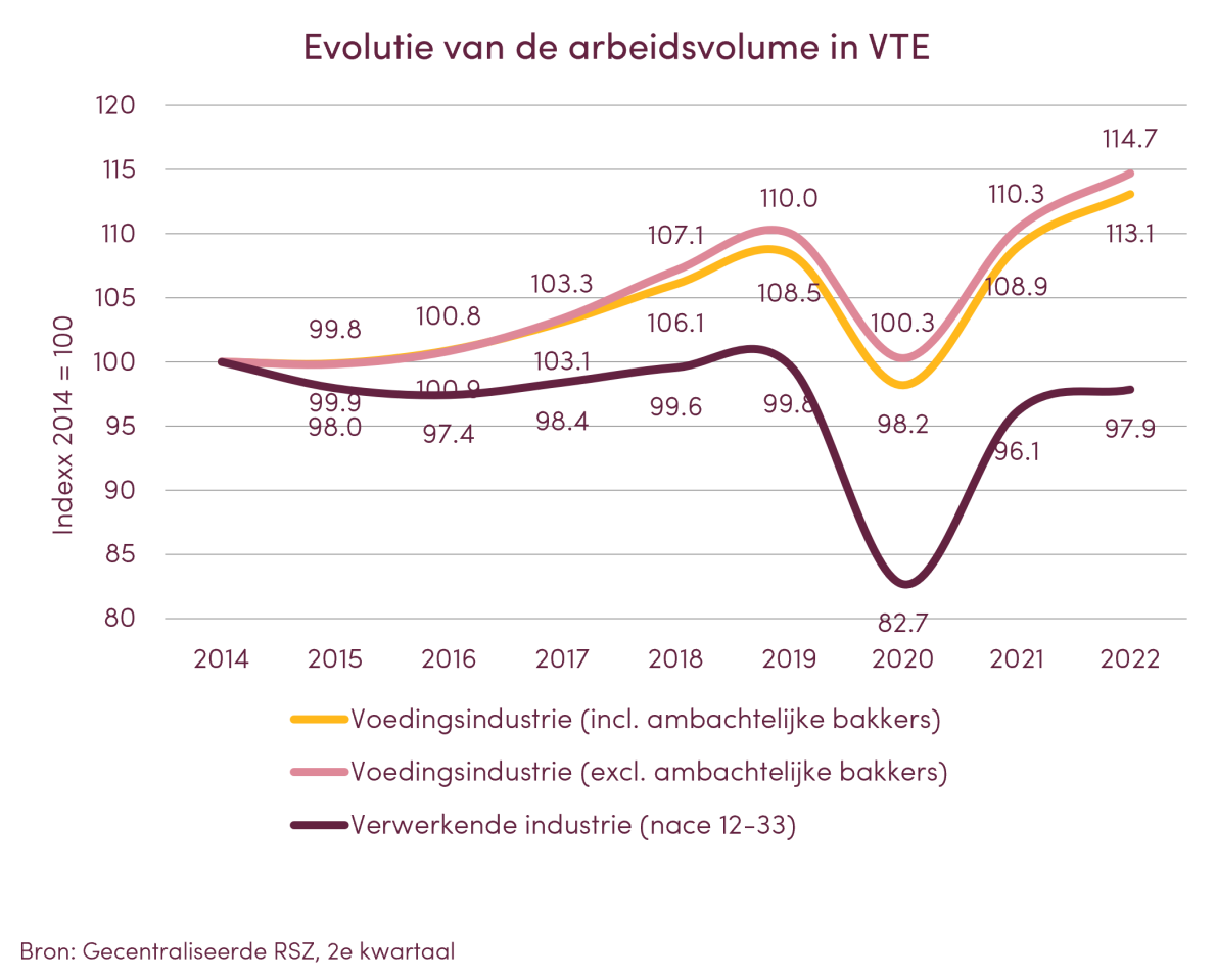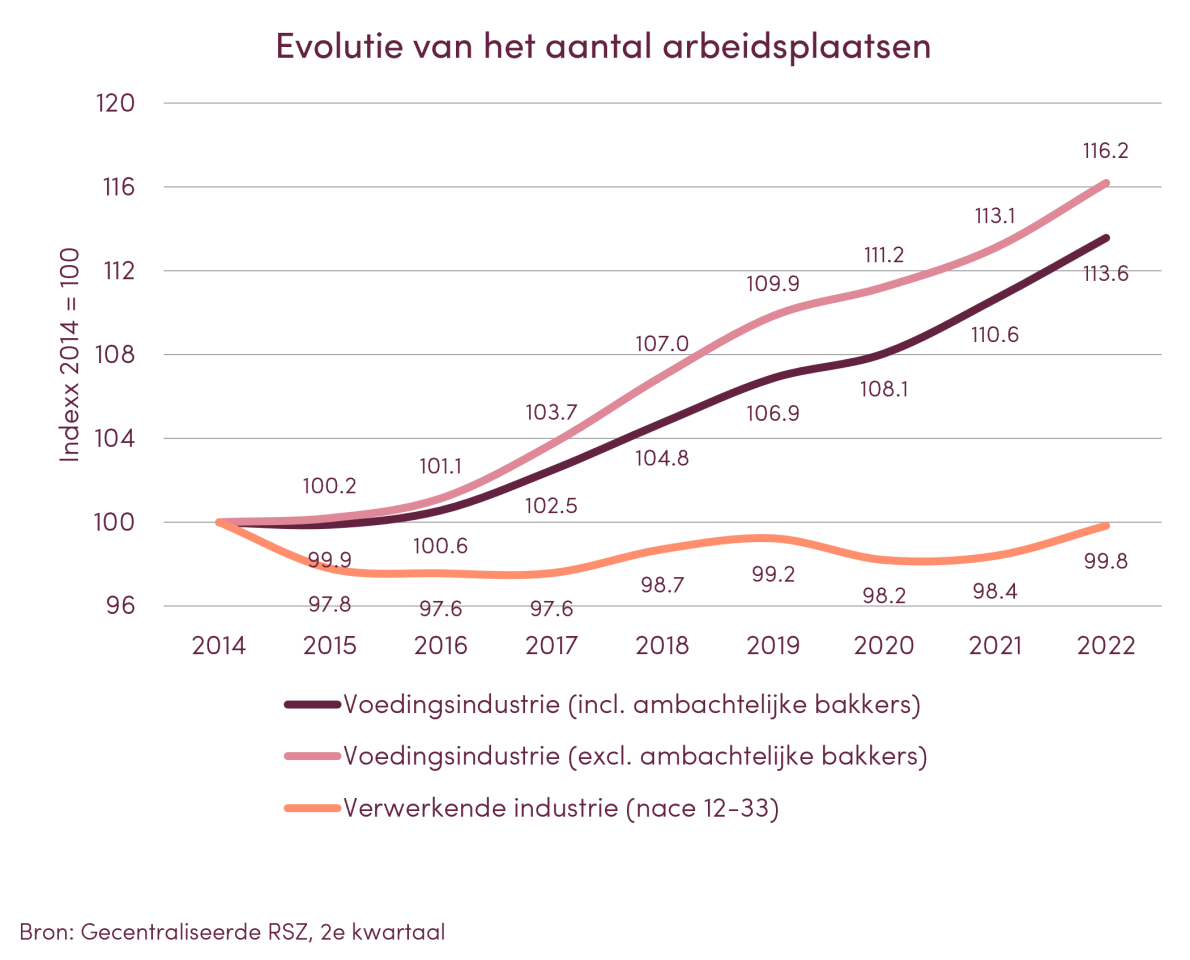 In 2022 was de voedingsindustrie veruit de grootste industriële werkgever in België. De teller voor de sector stond op 100.546 banen. In vergelijking met 2021 zijn er dit jaar meer dan 2.600 banen bijgekomen. Dit is een toename met 2,6%. Dit strookt met de voortdurende stijging van het aantal jobs in de voedingsindustrie sinds 2015 (en zelfs sinds 2010 als we de ambachtelijke bakkerijen buiten beschouwing laten).