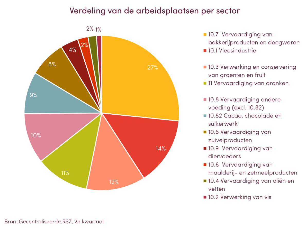 De 3 grootste sectoren in termen van werkgelegenheid zijn de bakkerijsector, de vleesindustrie en de sector verwerking en conservering van groenten en fruit. Samen zijn zij goed voor 53% van de totale werkgelegenheid.